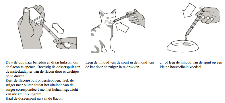 De oplossing dient te worden toegediend met behulp van de bijgesloten doseerspuit. De spuit past op de flacon en heeft een maatverdeling op basis van kg lichaamsgewicht.
